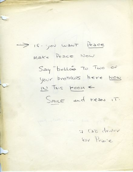 Context #7, 1970. 7 black notebooks with pages, ink, graphite, crayon, postage stamps, photograph, sugar package on paper. Each 11.75 x 11 x 3” each, (29.84 x 27,94 cm each). #70008. Detail: If You Want Peace. Collection Walker Art Center. © Adrian Piper Research Archive Foundation Berlin.