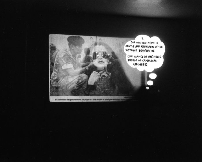It’s Just Art, 1980. Performance documentation: B&W offset poster, 10 13/16" x 14 1/8" (27,5 x 35,9 cm), performance diagram, 8½ x 11" (20,9 x 27,9 cm), 15 silver gelatin photographs on baryte paper with handwritten texts, 11 13/16" x 8 1/4 (30 x 21cm), 3 collages with handwritten texts, 10" x 8" (25,4 x 20,3 cm), video reconstruction of performance elements, 00:24:44. Detail: Photo #7 of 15. #80002.1-20. Private collection. © APRA Foundation Berlin.