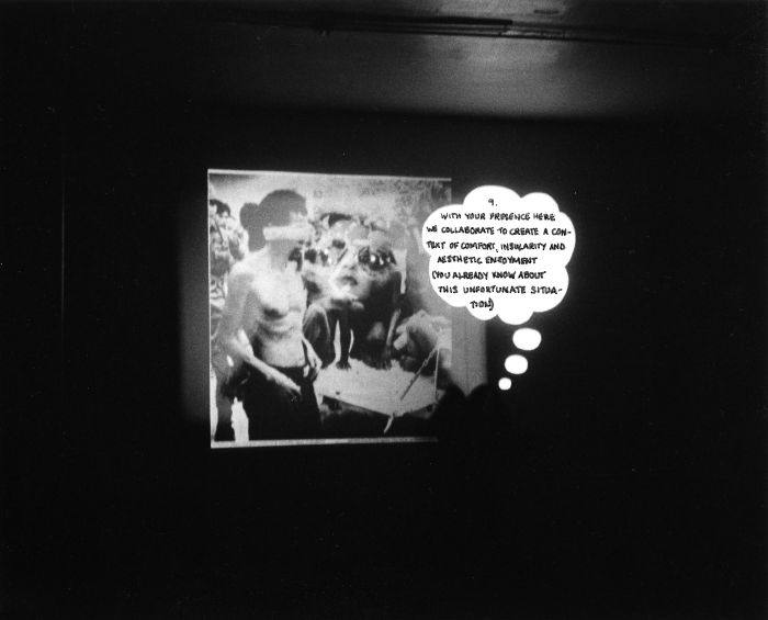 It’s Just Art, 1980. Performance documentation: B&W offset poster, 10 13/16" x 14 1/8" (27,5 x 35,9 cm), performance diagram, 8½ x 11" (20,9 x 27,9 cm), 15 silver gelatin photographs on baryte paper with handwritten texts, 11 13/16" x 8 1/4 (30 x 21cm), 3 collages with handwritten texts, 10" x 8" (25,4 x 20,3 cm), video reconstruction of performance elements, 00:24:44. Detail: Photo #9 of 15. #80002.1-20. Private collection. © APRA Foundation Berlin.